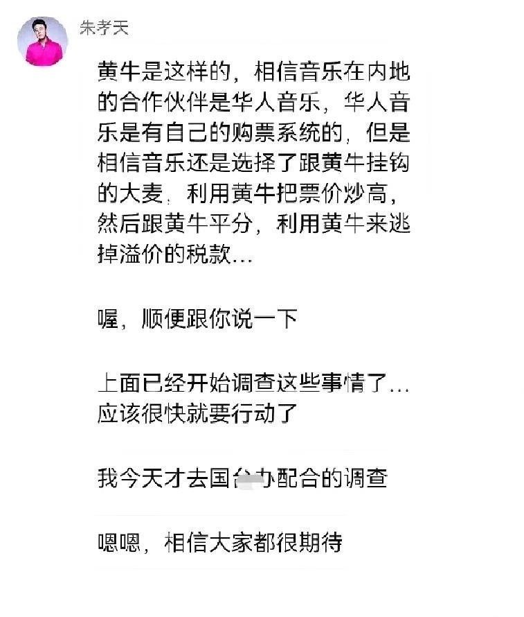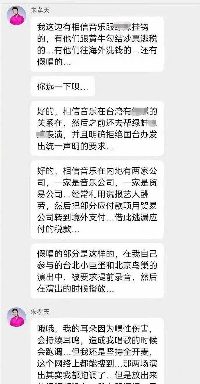 2. 昨晚,朱孝天彻底撕下伪装,在粉丝群中公开炮轰相信音乐,直指该公司存在多项严重问题,包括与黄牛暗中勾结、涉及立场争议、涉嫌逃税以及假唱等行为。他言辞激烈,描述细节详尽,甚至声称自己已配合相关部门调查,语气宛如亲历其事,引发舆论迅速升温。
