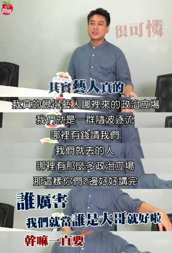 15. 讽刺的是,早年他在一次采访中曾直言:“艺人哪有什么政治立场?我们不过是随波逐流的一群人,哪里给钱就往哪里去。”他还补充道:“你们两边谈好了就行,谁强谁就是大哥,干嘛非要逼艺人站队表态?”